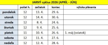 | 35 | mládež a dospelí začiatočník/neplavec (N) | NEDEĽA | NIVAM Iuventa | 12.4. – 28.6. 2026 |jarný cyklus | 200€ | PRIHLÁŠKA |